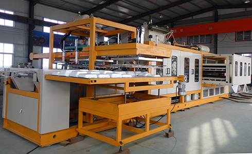 本公司研制開發的自動成型裁斷一體機是一種全能型的熱成型裁斷機組,以真空成型為主,兼壓空成型、模壓成型及綜合成型,可加工多種熱成型塑料片材。機組采用全電腦PLC控制,具有結構先進,性能穩定,易操作,產量高,成型面積大,自動化程度高等特點。本機主要用于成型PSP材料,用于食品餐盒、托盤、碗、杯等各式包裝制品。本設備的最大優點是集成型裁斷一體。生產出的成品直接堆垛收集。本設備在生產過程中除了節能降耗等優點外,還大大節省了工作面積、生產時間和勞動力的支出。